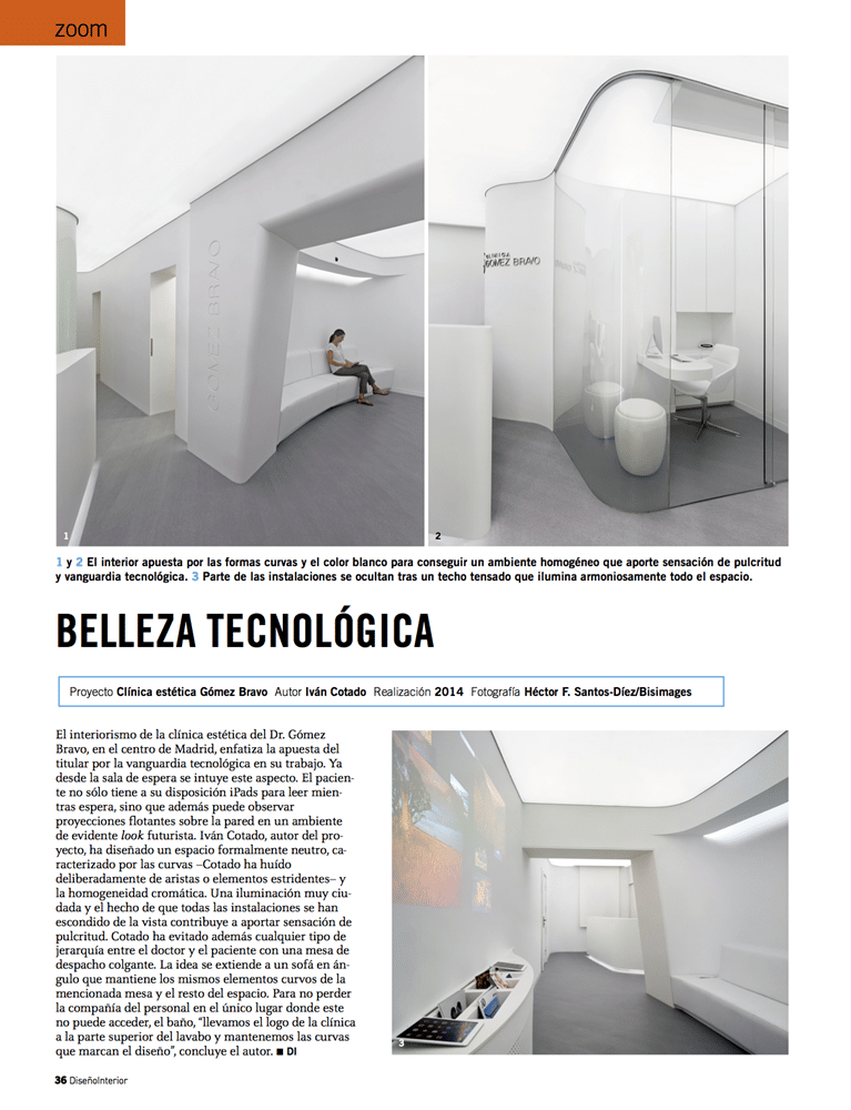 Texto publicado en el nº 269 (marzo 2015) de la revista DISEÑO INTERIOR, a propósito del proyecto de interiorismo realizado por este estudio en la Clínica Gómez Bravo de Madrid.