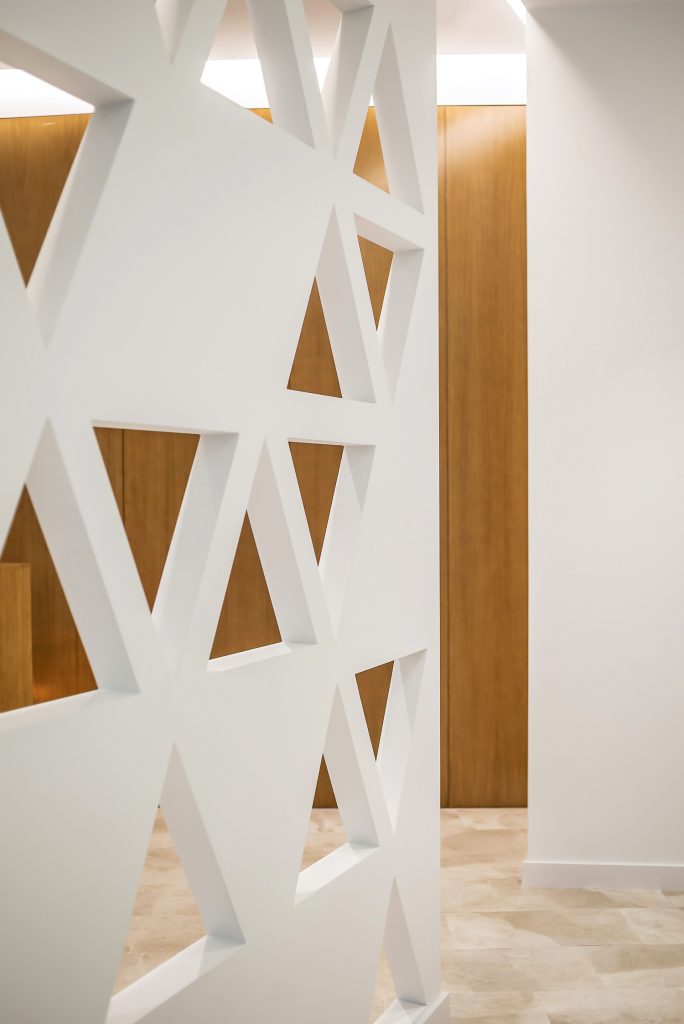En Sala Clinic, nombre comercial de la clínica de referencia, nos inspiramos en una dentadura perfecta para diseñar el paramento que delimita la sala de espera e incluso para revestir paredes y puertas de espacio más singular del negocio, el distribuidor central.