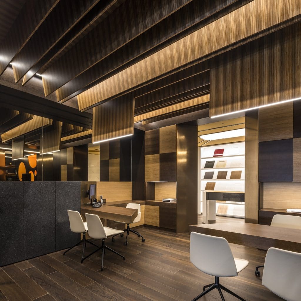 Se plantea una distribución articulada a partir de un majestuoso pasillo que refleja la capacidad de la marca para trabajar con diversos materiales y magnitudes, como el Krion o las lamas de tablero rechapado de Zebrano de Finsa, que enmarcan el recorrido principal en una disposición inspirada en la forma de apilar tableros en un taller de carpintería.