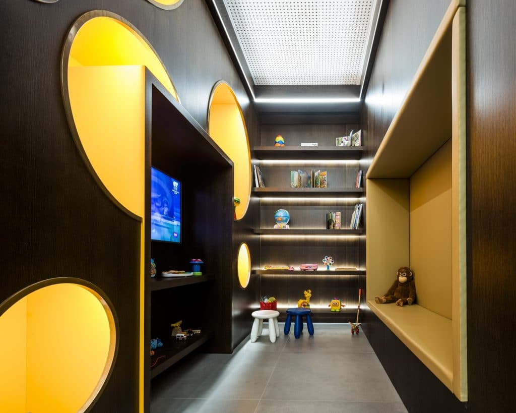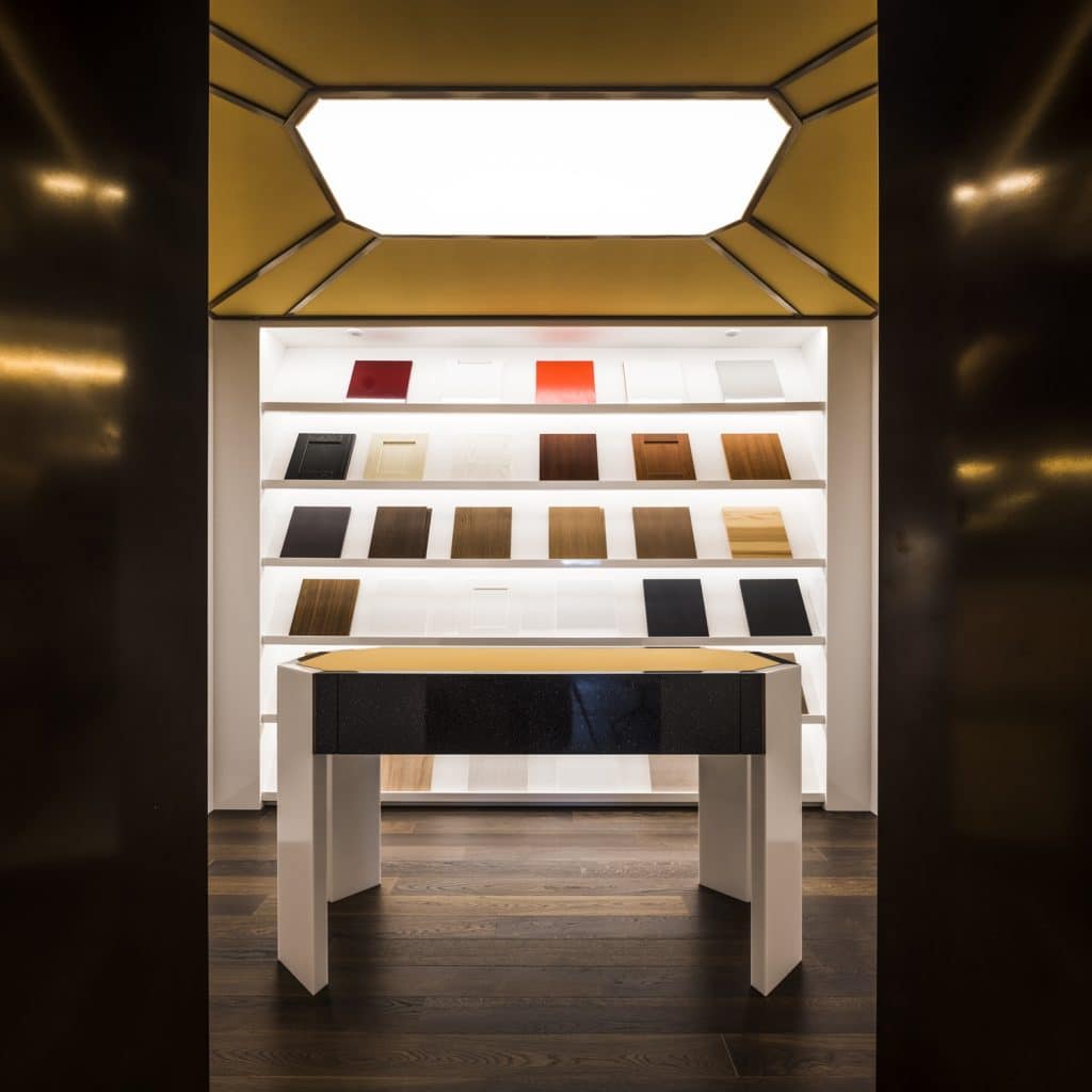 La operatividad del showroom está contemplada en el diseño. Así, disponemos cuatro puestos de atención personalizada, una pequeña zona de espera y una sala infantil pensada para optimizar la experiencia del cliente con hijos. Pero hay dos soluciones que llevan esta experiencia al estado emocional que toda gran marca deber perseguir, una es la sala de reuniones, de la que hablaremos más adelante, y otra es la sala de muestras.