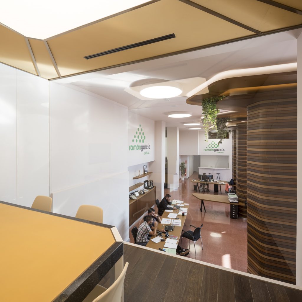 Por último, y no por ello menos importante sino al contrario, las oficinas de contract. Un espacio de trabajo cómodo, funcional y corporativo, pero también majestuoso, motivador y estratégico, inspirado en grandes árboles construidos a partir de múltiples laminados que reflejan los años de experiencia en el tratamiento de la madera del Grupo Ramón García.