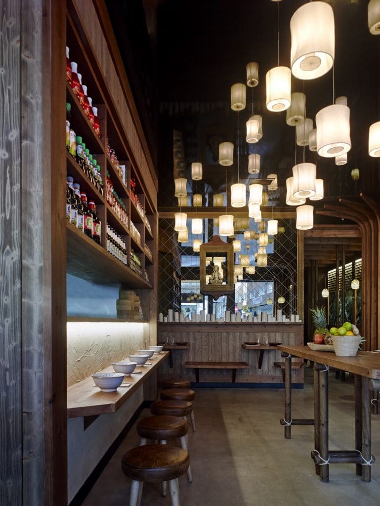 Y en cuanto a la iluminación, verdadera protagonista del diseño y la identidad del restaurante, reforzamos el mensaje con una característica suelta de farolillos voladores simulados, que en este caso forman parte de la iluminación de sala y han sido diseñados y fabricados a mano para la ocasión. Gracias a un falso techo de melamina negra alto brillo logramos un espacio infinito sobre el que se reflejan los farolillos iluminados y conseguimos plasmar la que es, quizá, la imagen más evocadora de Tailandia y la más fotografiada del restaurante.