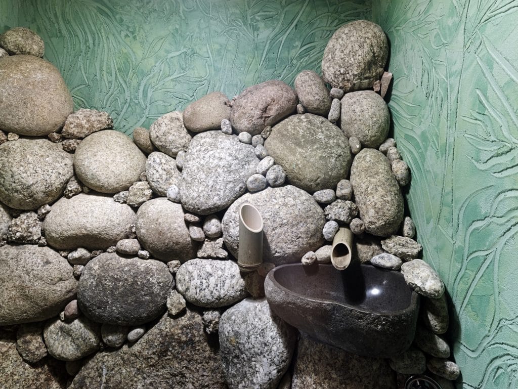 Y finalmente, en los baños de Koh Lanta vuelve la selva virgen. Disponemos piedras apiladas que sostienen un lavabo, también de piedra, y paredes con motivos florales realizados en fresco por una artesana sobre el mortero teñido en verde. Y el agua que no sale por un grifo metálico, sino por un caño de bambú natural.