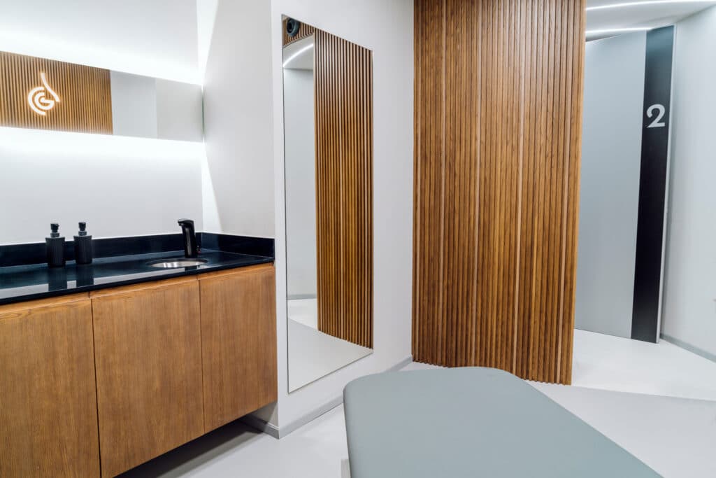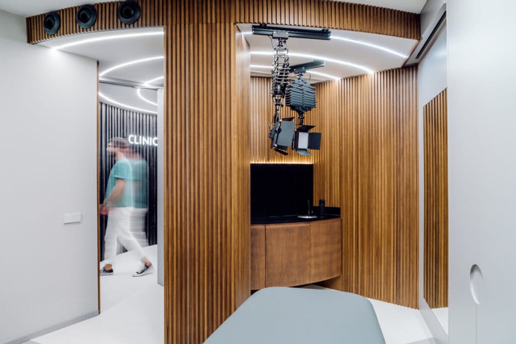 El apartado de iluminación es realmente significativo en este espacio, pues no solo resuelve aspectos funcionales y prácticos, sino que se convierte en verdadera protagonista estratégica acompañando el efecto «transformación» desde la recepción, reforzando con iluminación led empotrada en el techo los círculos concéntricos que identifican y representan esta clínica.
