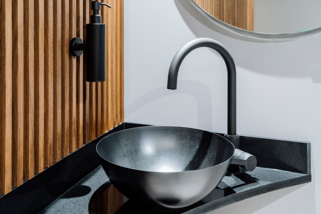 La paleta cromática es ciertamente singular para el sector sanitario. Evidencia la trayectoria de la marca Guilarte. Donde suele haber blancos puros y monocromo, elegimos grises, maderas nobles de tonos dorados y acabados oscuros coronados por sanitarios y Krion en puro negro en los baños.