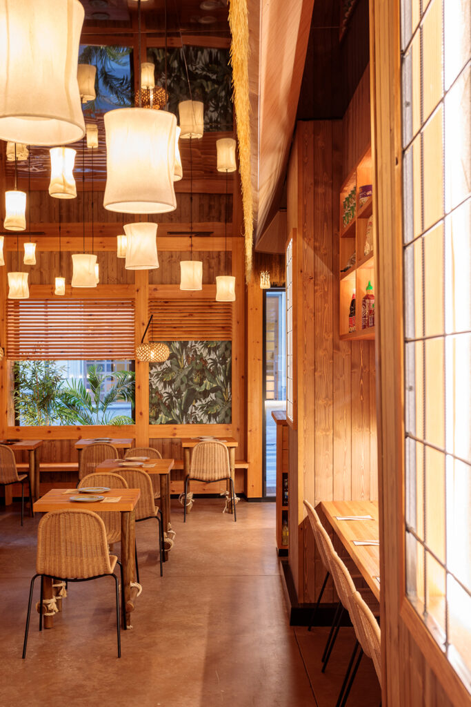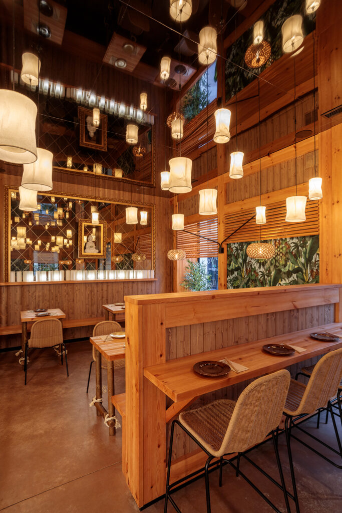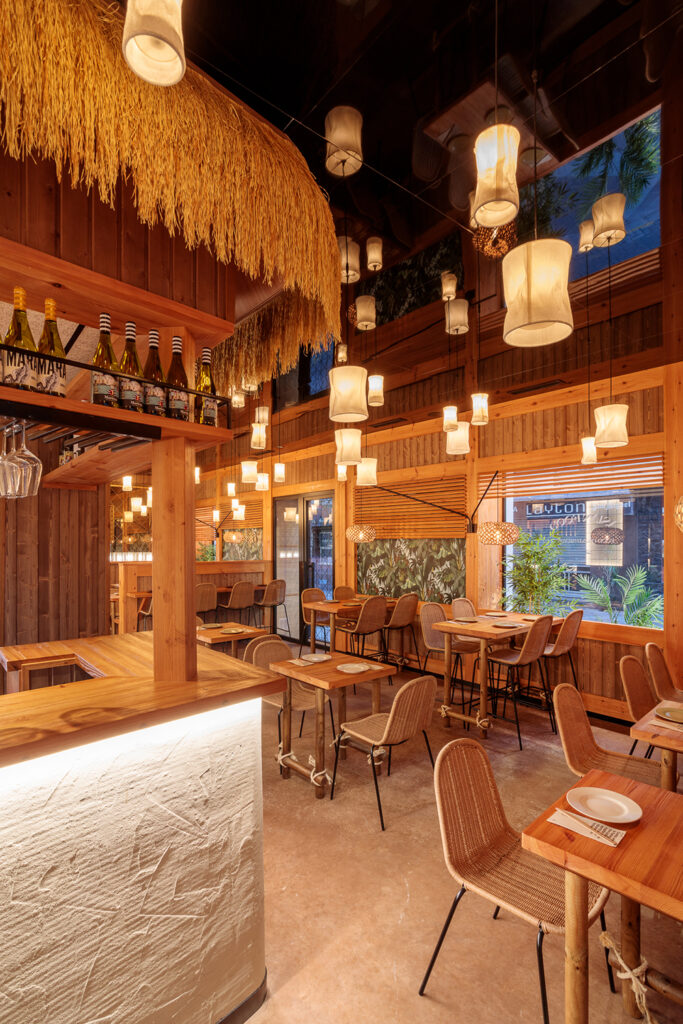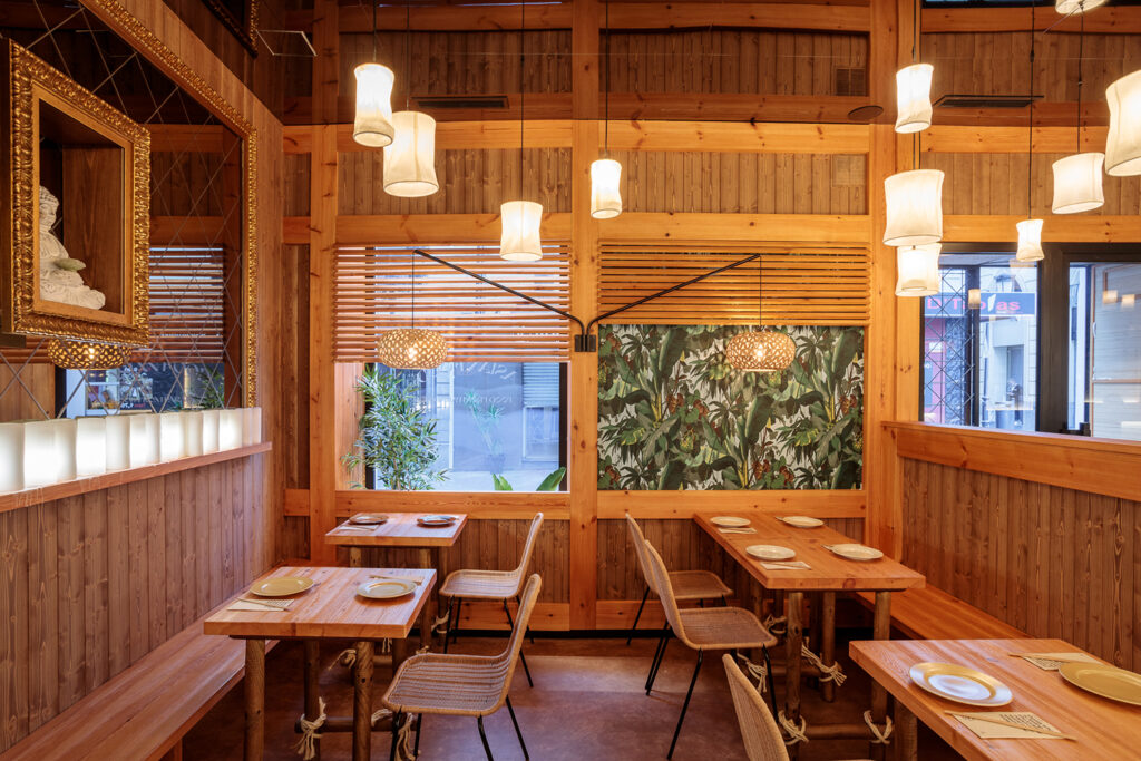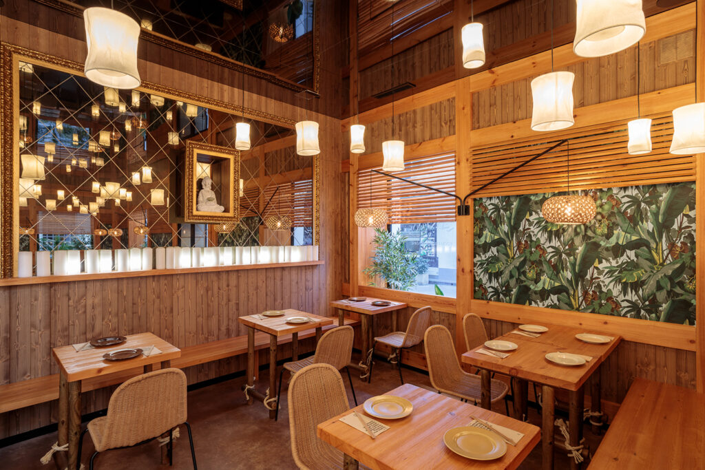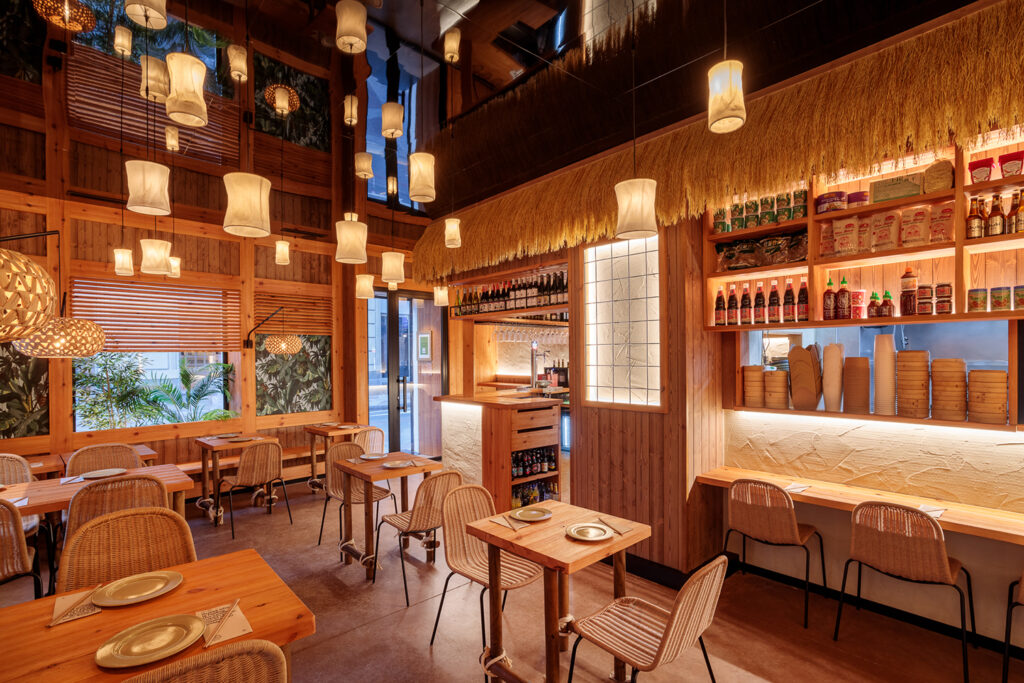 Entre las novedades de este local, destaca el tejado de cañizo que corona la barra y la zona de cocina. Inspirado en las construcciones tradicionales tailandesas, este elemento combina estética y simbolismo, convirtiéndose en un punto focal que refuerza la identidad cultural del espacio. La barra, ubicada estratégicamente bajo este tejado, actúa como un eje dinámico que invita a los clientes a disfrutar del vibrante ambiente del restaurante.