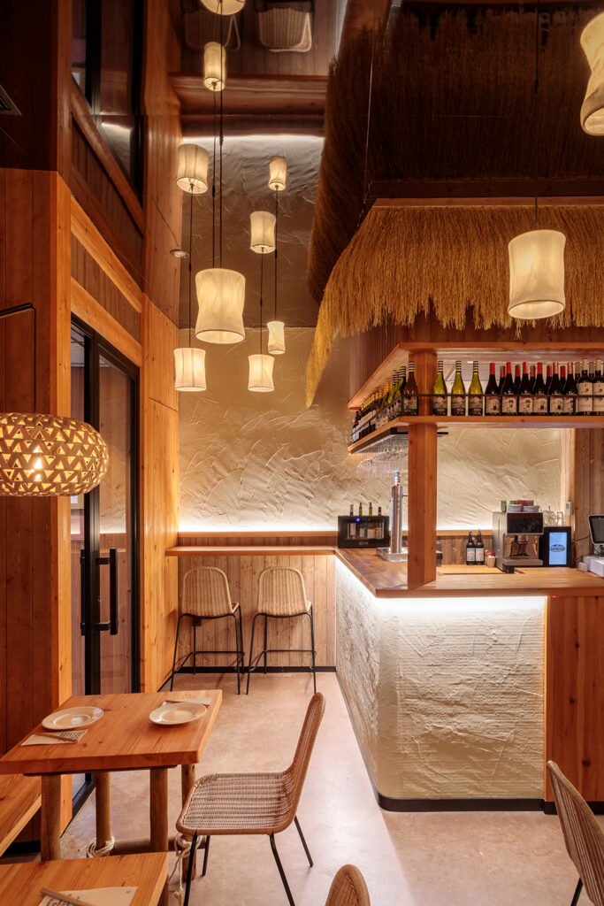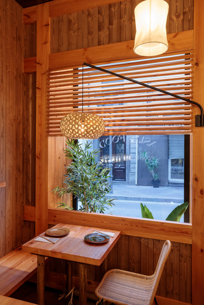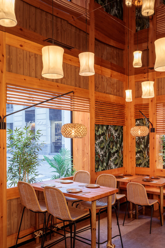 La sostenibilidad es otro pilar fundamental en este proyecto. Los materiales seleccionados, como el bambú y el pino nacional, no solo aportan calidez y autenticidad, sino que también responden a criterios de durabilidad y responsabilidad ambiental. Estos detalles, junto con la iluminación digital inteligente que varía a lo largo del día, contribuyen a hacer de este local un espacio contemporáneo y respetuoso con el medio ambiente.