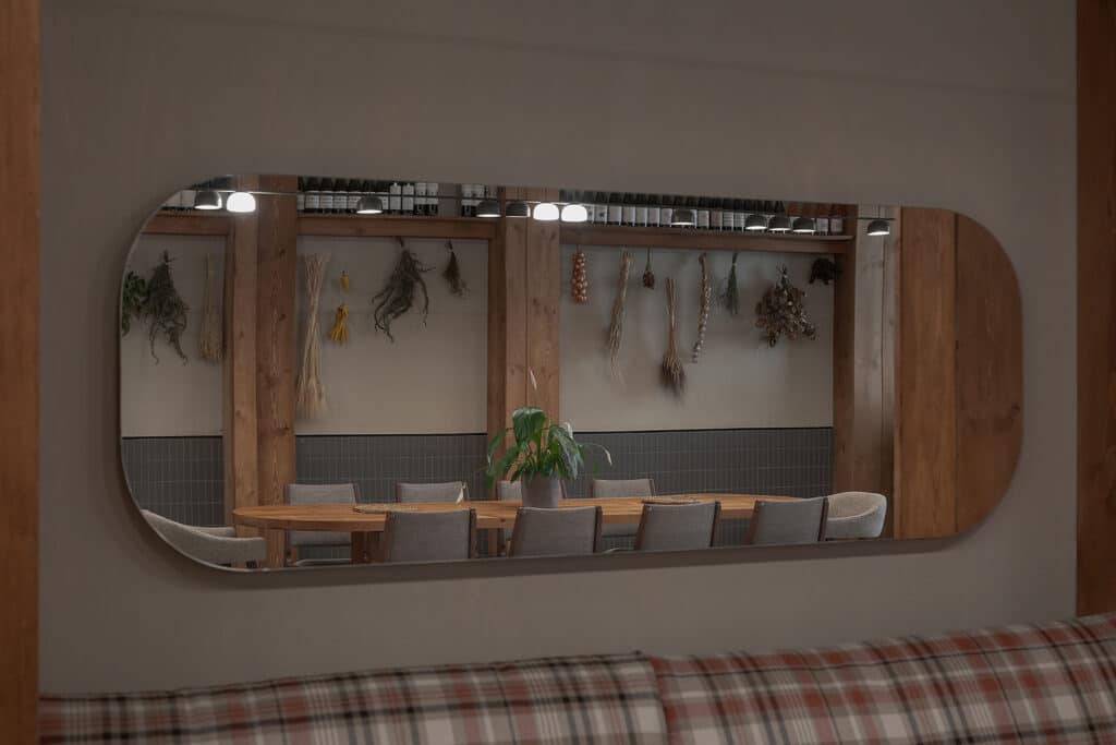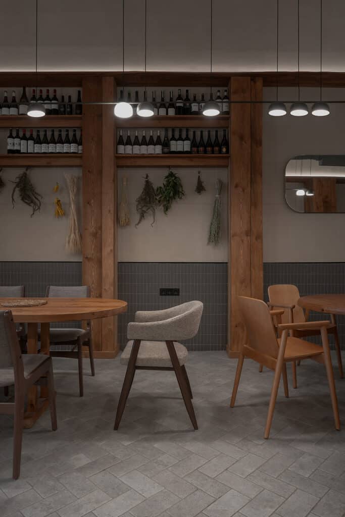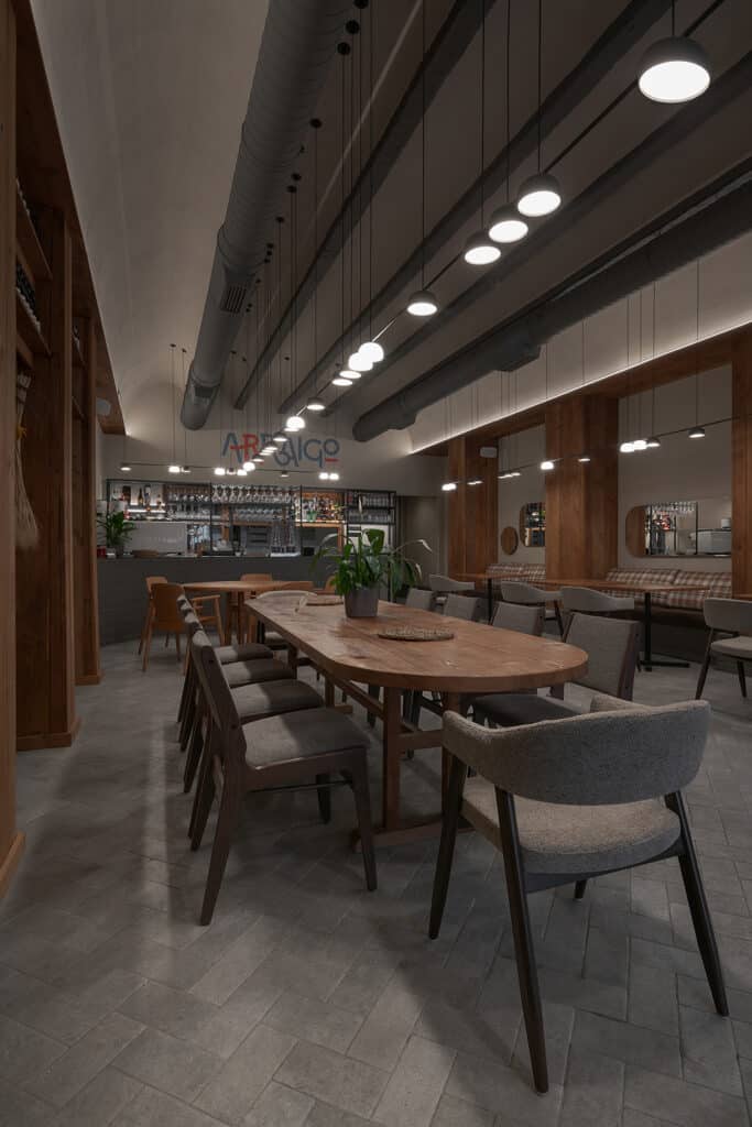 A nivel visual, la gran altura del local se aprovecha para jugar con la iluminación. Las luminarias suspendidas no solo ordenan el espacio, sino que aportan ese contrapunto contemporáneo que hace que el conjunto no se quede en lo rústico, sino que respire sofisticación.