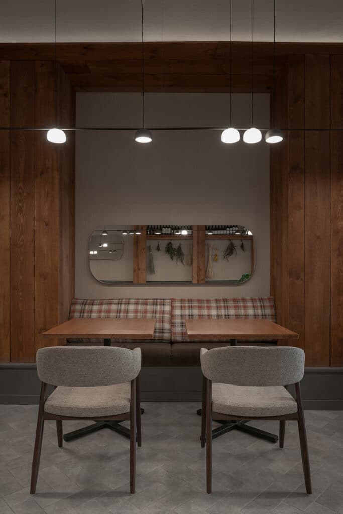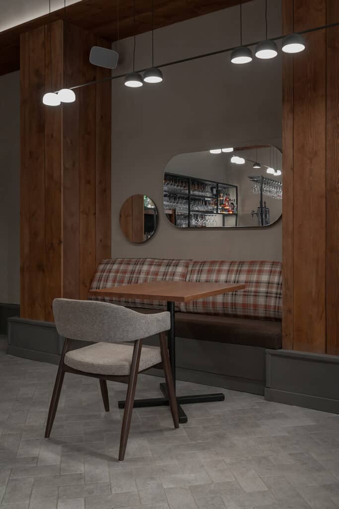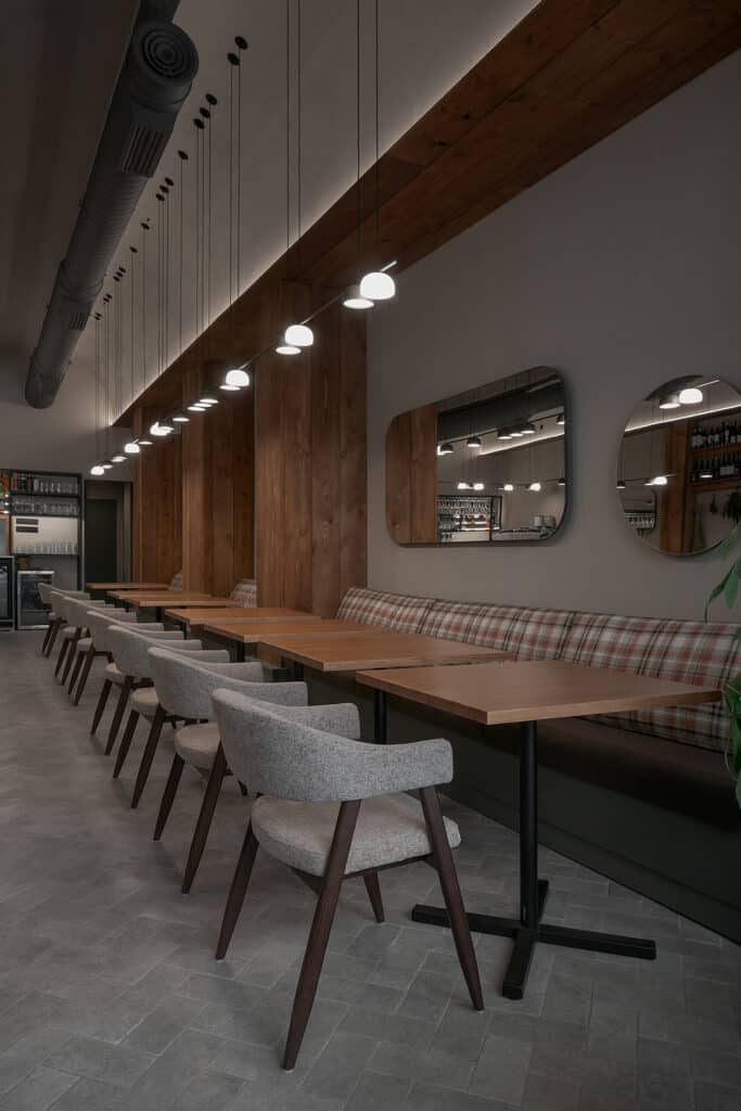 Se ha replanteado por completo la distribución del espacio. La barra deja de ser el centro para pasar al fondo, y eso lo cambia todo: el comedor se abre, gana amplitud, flexibilidad y confort. Y en la entrada, un punto de servicio pensado para atender tanto a los de fuera como a los de dentro hace que el local funcione con agilidad, sin interferencias.